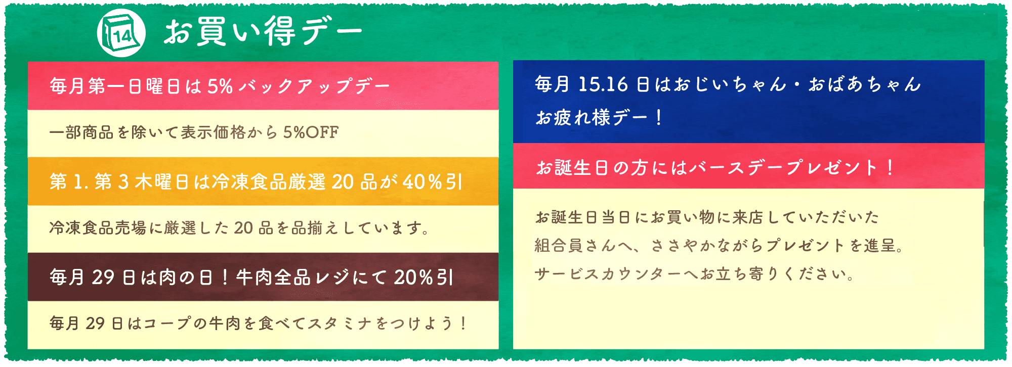 「バースデープレゼント」「おじいちゃんおばあちゃんお疲れ様デー」「5%バックアップデー」など、楽しい!うれしい!企画でお買い物を楽しんでもらえるようにしています。有人試食を通して組合員さんとの会話も大切にし、いただいた声を買い場づくりに活かしていきます。